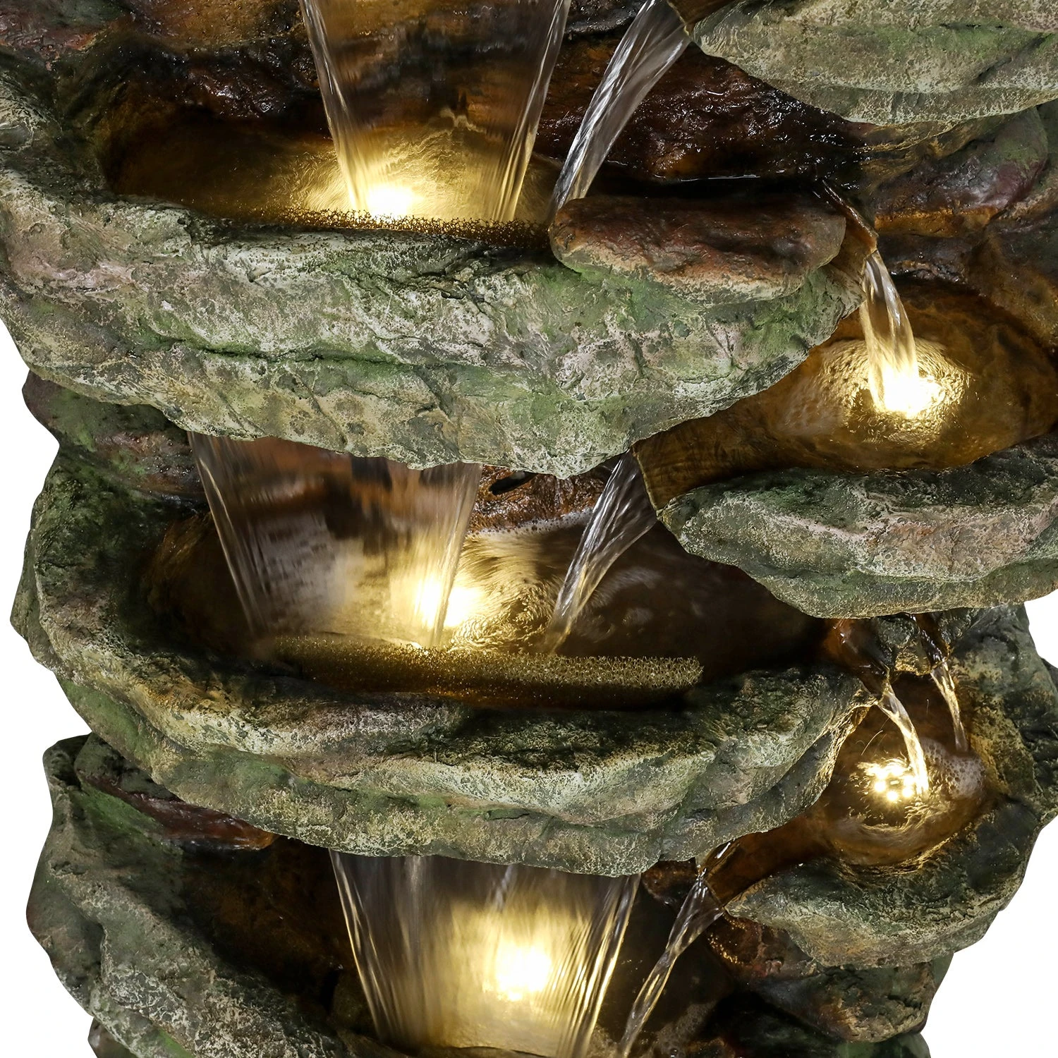 - Naturalistic Multi-Tiered Rock Design: The fountain is constructed from a blend of high-density resins and natural stone aggregates, expertly finished to replicate the texture, color, and weight of real weathered rock. The multi-tiered cascading design creates a dynamic visual journey for the water, flowing gracefully from one level to the next.